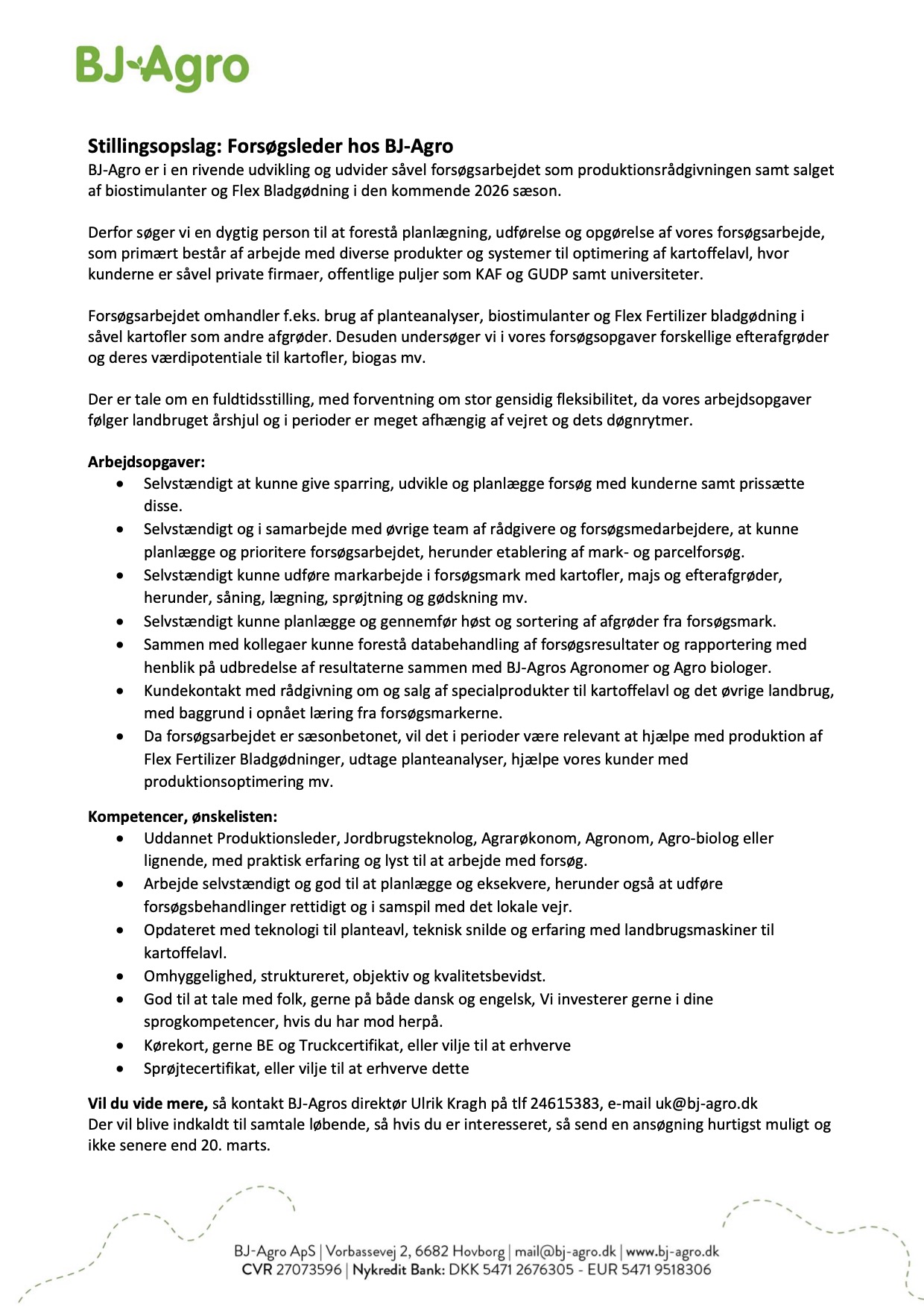 Stillingsopslag: Forsøgsleder til BJ-Agro ApS, Hovborg